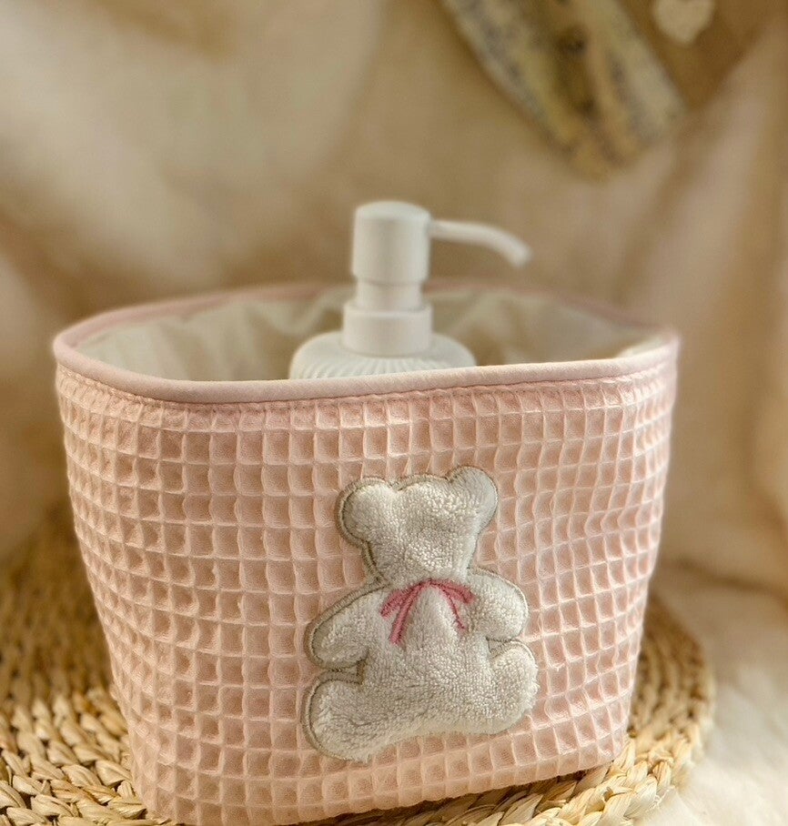 • Un panier en tissu (avec intérieur imperméable, parce qu’un fond de teint renversé, ça arrive même aux meilleures). Parfait pour organiser pinceaux, rouges à lèvres, crèmes et autres trésors de beauté.